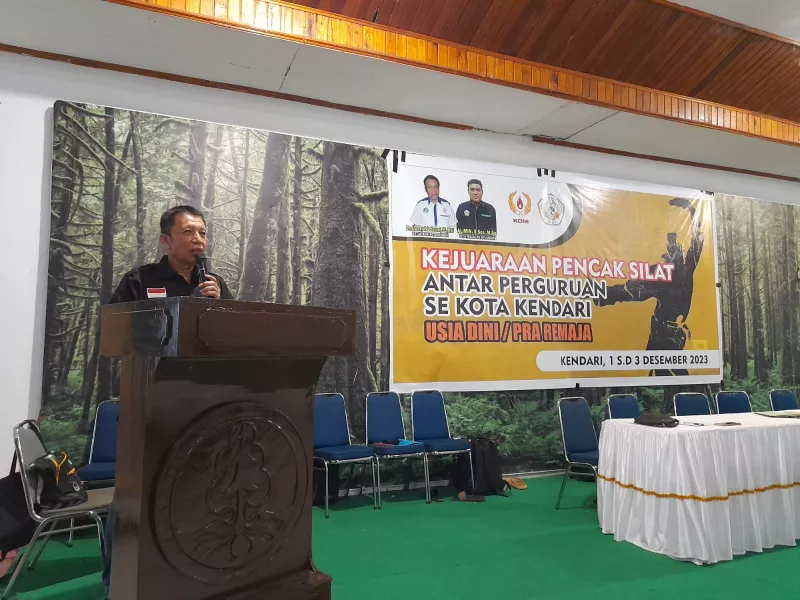 KENDARIAKTUAL.COM, KENDARI – Ketua KONI Kota Kendari Alamsyah Lotunani membuka Kejuaraan Pencak Silat antar perguruan se Kota Kendari kategori usia dini dan Pra Remaja, Jumat (2/12/2023) di aula Dinas Kehutanan Sultra.