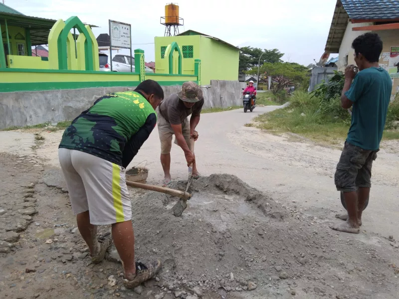Selain menggali drainase, warga bersama relawan ASR juga menambal jalan rusak dengan campuran semen.